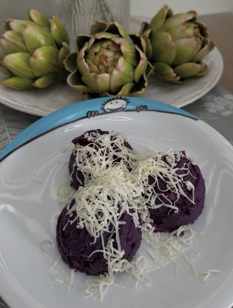 This month was purple yam (ube) and Guimaras mango month in our kitchen. I was so happy to be able to get fresh and deeply pigmented purple yam, which no longer called for ube extract to enhance the color of ube halaya that I was making. I also had really nice and sweet mangoes that perfectly paired with purple yam.