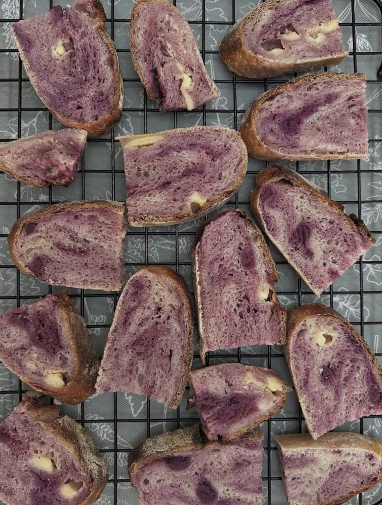 As such, for Part 1 of our ubemangoserye, our very first ube mango chiffon cake with buttercream frosting graced our kitchen. Making this 6-inch cake took much longer than I thought, but I must say that it’s worth all the effort. I honestly forgot to color the cake batter purple, but the inside of the cake still matched the mango toppings when sliced. And it turned out to be a fluffy cake with ube halaya filling, real ube sprinkles, and sliced mango toppings. The cake piping and the slightly lopsided cake only showed that I need more practice. Nonetheless, I’m happy to say that it’s only in the frosting that I used ube extract as coloring. All the rest were original purple yam color! Other purple yam highlights included ube vanilla yoghurt smoothie, ube halaya topped with grated cheese, and ube cheese sourdough bread. I was so mesmerized by how pretty the sliced bread looked like.