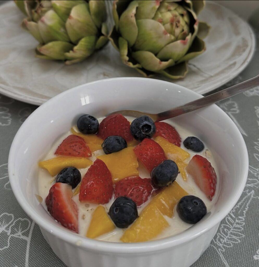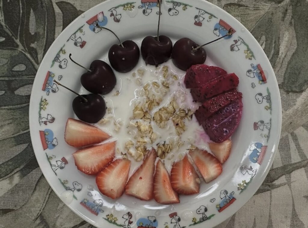Finally, there’s another overnight oat breakfast for our teenager. It has actually become intentional to have overnight oats as part of our regular breakfast menu. I learned that adding two to three types of fresh fruits and some honey makes it more appealing and palatable to him.